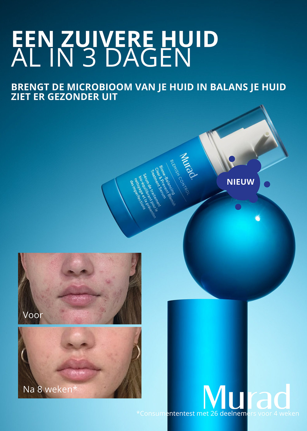 Het Murad Biome Balancing Clear & Prevent Blemish Treatment Serum is speciaal ontwikkeld voor de acnegevoelige huid die snel uit balans raakt. De formule versterkt het natuurlijke microbioom van de huid – de goede bacteriën die je huid gezond en sterk houden. Door dit evenwicht te ondersteunen, helpt het serum puistjes en mee-eters actief te verminderen en voorkomt het nieuwe uitbraken, zelfs bij hormonale schommelingen. De huid wordt kalmer en blijft beter in balans. Omdat het serum zacht is en de huid niet irriteert, kan het dagelijks worden gebruikt zonder roodheid of schilfering. Bij regelmatig gebruik ziet de huid er helderder, egaler en gezonder uit, vaak al vanaf dag 3.
