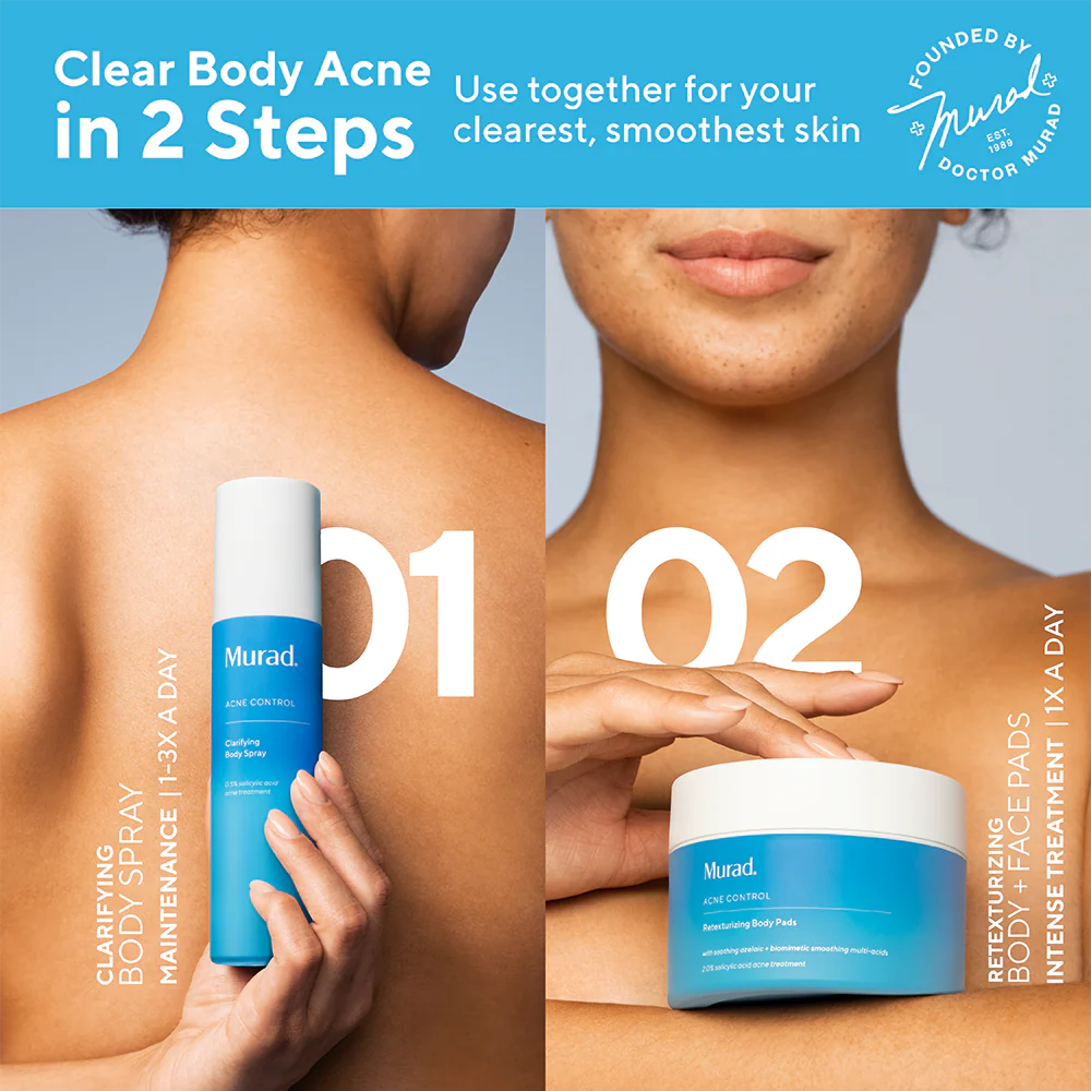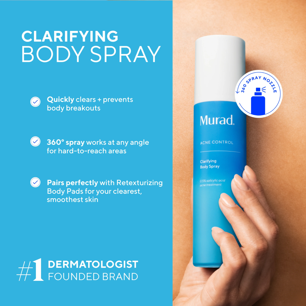 Sneldrogende spray die acne en onzuiverheden op het lichaam helpt verminderen en toekomstige uitbraken voorkomt. De 360°-spray maakt aanbrengen makkelijk, zelfs op moeilijk bereikbare plekken.
